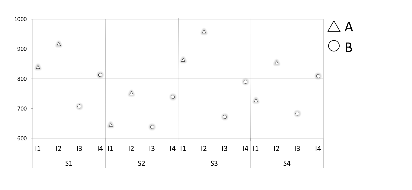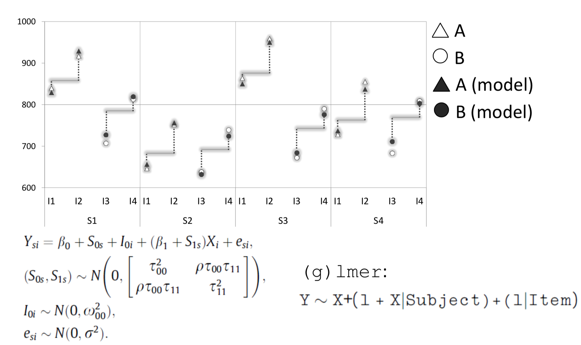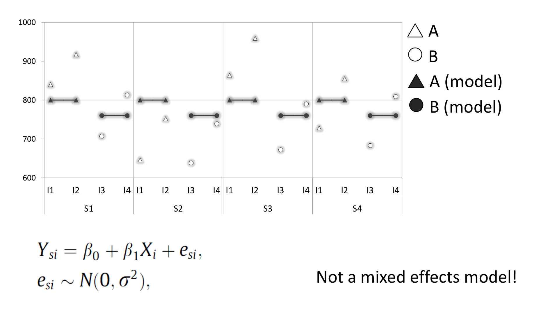 In the following example, borrowed from Barr et al. (2013), we look at a hypothetical experiment that examines the effect of “stimulus type” (A and B) on reaction times (RTs measured in ms). Our sample has only 4 subjects (S1 to S4) each of whom judged 4 items (I1 to I4). The resulting 16 data points are illustrated below.
