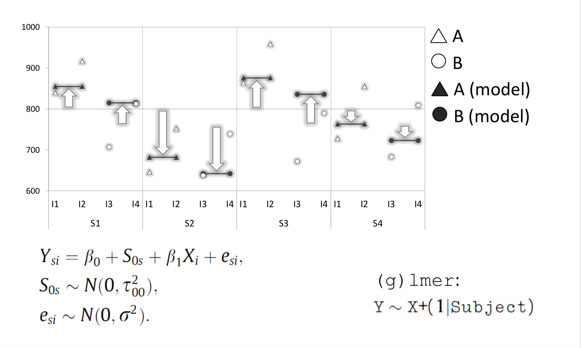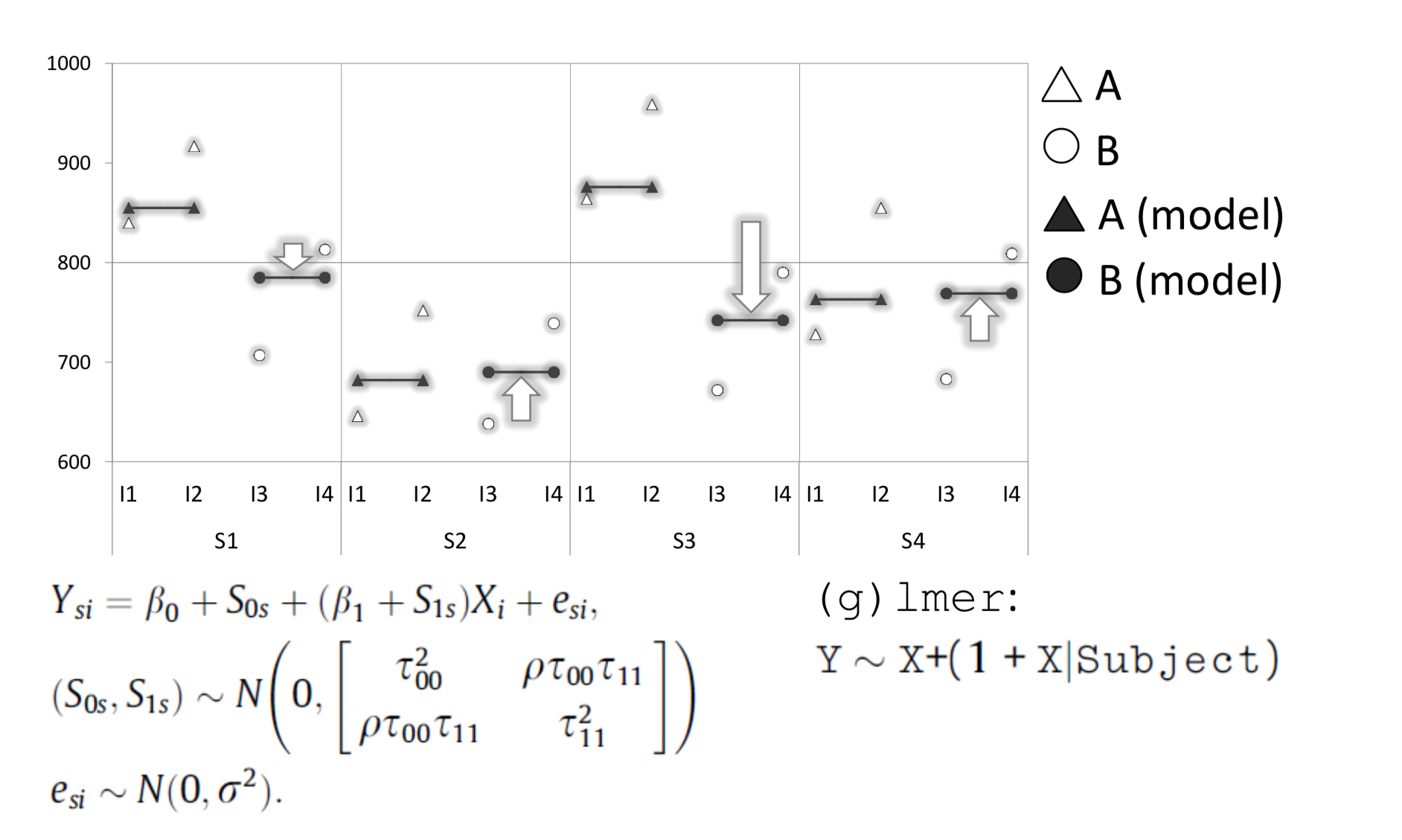 By introducing by-subject “random slopes”, we can model the mean RT for each subject in each condition. The slope captures the change between condition A and B.