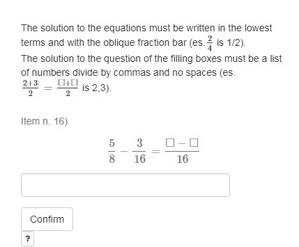 "Item n. 16) $$ \\frac{5}{8}-\\frac{3}{16}=\\frac{\\Box-\\Box}{16}$$"